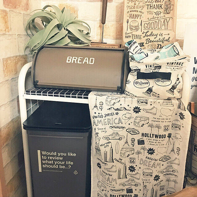ネット限定販売のゴミ箱を使っているのは、rumiさん。持ち手がついていることや、プッシュするだけで蓋を開けられるなど機能的にも優れたゴミ箱ですよ。キッチンインテリアとして人気のブレッドケースや、エアープランツとの相性もバッチリ。柔らかな色合いでまとめた、カフェ風のコーナーになっていますね♪