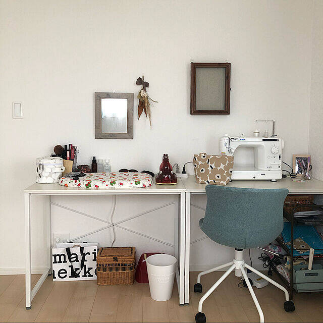 ミシンを置いてアトリエスペース兼、朝のメイクをする場所にmicaさんはニトリの「デスク(ザッキー 95 WW)」を使用されています。どんなスタイルにも合わせやすいシンプルなデザインで、スチールフレームの丈夫さもポイントに。汚れがつきにくく、掃除がしやすい天板も作業スペースにはぴったりです。
