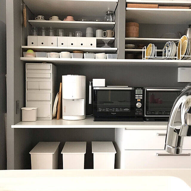 スッキリとシンプルに整えられているのが、mitsu20170805さんのキッチン収納です。大皿は立てて収納しているため、場所を余分に取ることもありません。小皿はボックスに入れて収納し、奥に置いたものも取り出しやすくする工夫を。カラーを厳選し、統一感に満ちた収納法となっています。