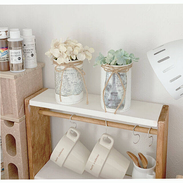 maiyukapiさんは缶詰めの空き缶にデコパージュし、フェイクフラワーをかざっています。空き缶をペイントし、英字のポストカード風のアイテムを貼りつけました。全体的に温かみのある風合いに仕上がっていますね。ナチュラルなカップホルダーやマグカップなど、スペースにマッチしています。