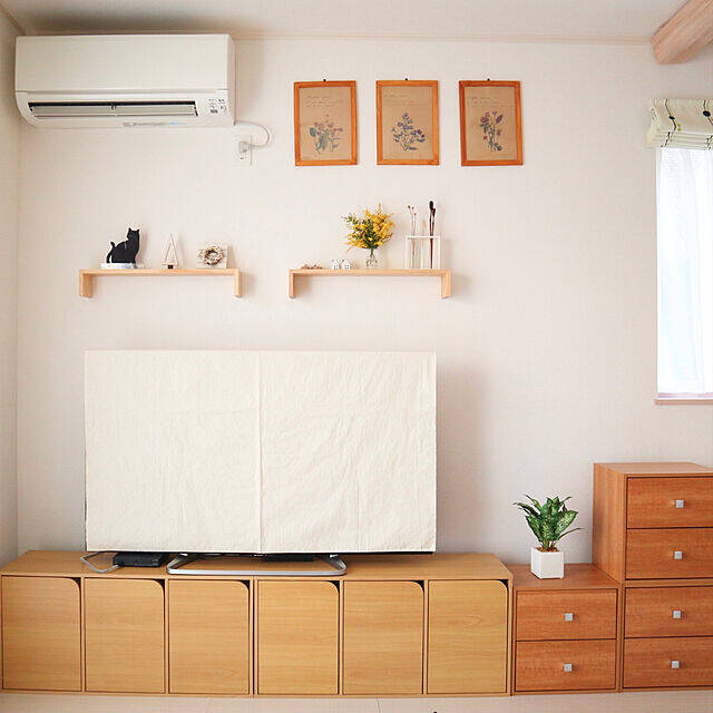 sayaka.さんはニトリの扉付きカラーボックスを横に寝かせる形にして、2台並べた上にテレビを置いています。「Nカラボ」という縦横どちらでも使えるカラーボックスで、使い方に合わせて扉の開き方が変えられる優れものです。テレビまわりのインテリアともなじんで、大きなテレビも圧迫感なく収まっていますね。