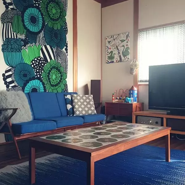 ramさんは、マリメッコの大きなタペストリーを壁にかけています。華やかな柄で、インパクトは抜群。ブルーやグリーンの鮮やかな差し色効果で、リビングが一気に明るい北欧スタイルになっていますよ。大胆なコーディネートですが、ソファやラグとカラーをそろえ、とてもセンスが良い空間になっています!