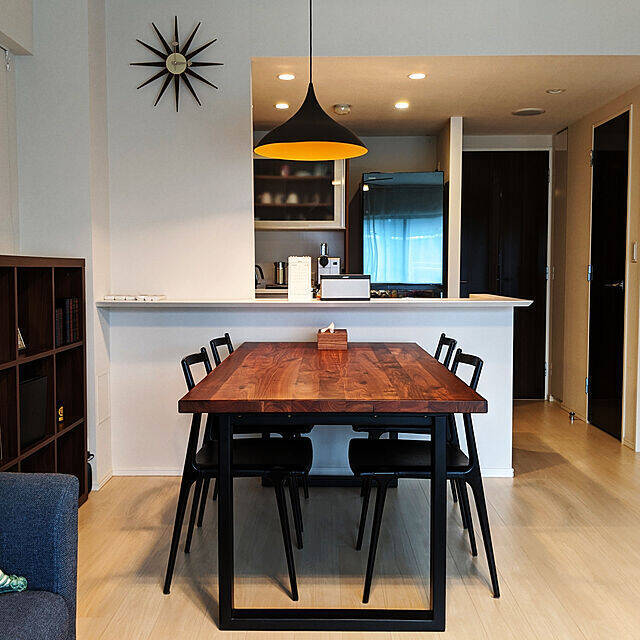 こちらのユーザーさんのダイニングテーブルは、天板が木目のブラウンカラーになっています。ブラックのチェアを組み合わせたことで、より重厚な雰囲気に。モダンでとてもかっこいいダイニングです。