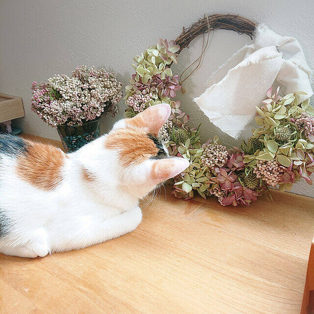 柔らかな色合いの紫陽花に、エリンジウムとライスフラワーを組み合わせたかわいいリースは、Gomaさんの作品。センスの光るお花と色の合わせ方はドライフラワー選びの参考にしたいですね。となりに置かれたライスフラワーのポットも空間に彩りを添えています。