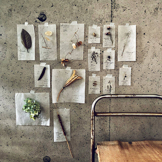 saokoさんはドライフラワーをワックスペーパーに貼り、手書きで英文を加えて標本風に仕上げました。テープでランダムに貼られたラフさが、こなれた雰囲気ですね。ワックスペーパーの透け感もオシャレです。