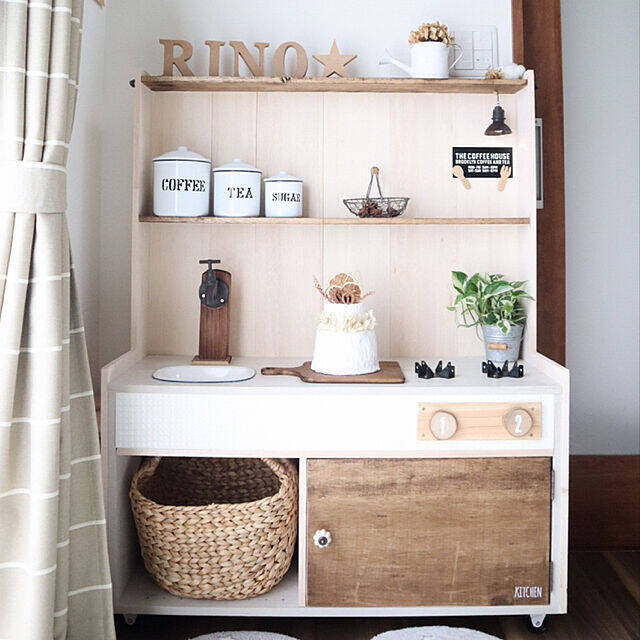 おままごとキッチンはカラフルなものが多いですが、DIYで作るとお好みのものができるのがメリット。まず最初に、インテリアに馴染むナチュラルなキッチンを作られたユーザーさんをご紹介します。