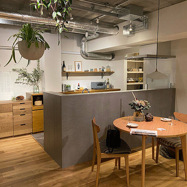 shikiさんは中古のマンションをリノベーションしました。キッチンの腰壁をモールテックスで仕上げていて、お気に入りだそうです。天井の配管をむき出しにして、無機質に。ダイニングテーブルや左奥のチェストは木目が温かく、随所に置かれた植物など、さまざまなテイストがうまく調和しています。