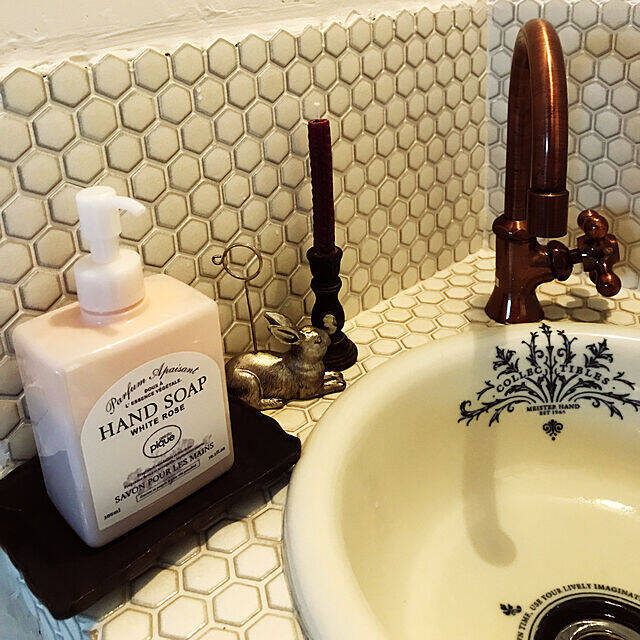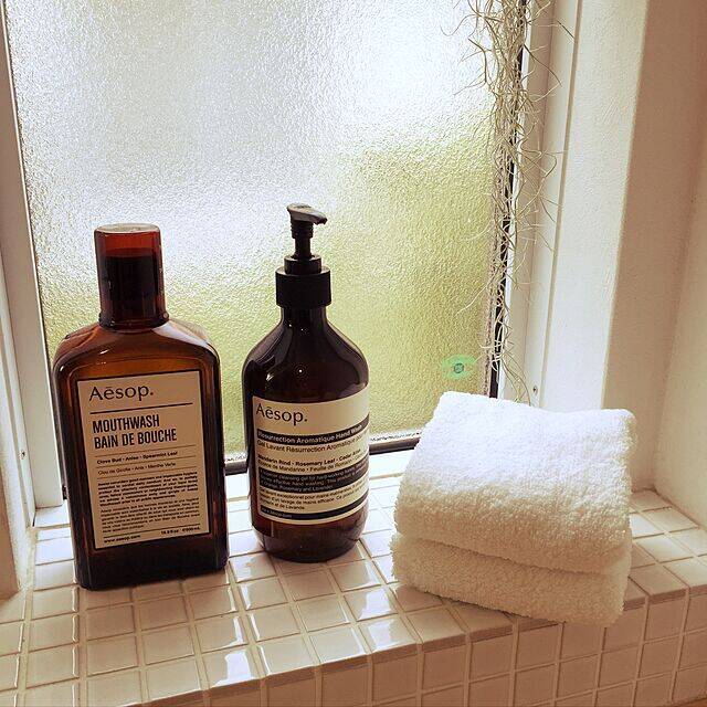 センスのよいパッケージで、プレゼントにも人気の高いイソップ。オーストラリアのコスメブランドです。satoさんは、イソップのハンドソープを使っていますよ。ホワイトタイルの洗面台に、イソップのスタイリッシュなパッケージが抜群に映えています。