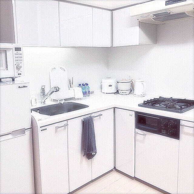 シンプルなイメージの716.cさんのキッチンです。ホワイトカラーを基調としたインテリアで、明るく広く見えますね。家電やまな板などもホワイトで統一。キッチン台も整理されていて、スッキリした印象になっています。