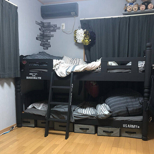 こちらのユーザーさんは、2段ベッドの下にグレーの「ベッド下収納バッグ」を6つ置いています。ブラックのベッドと色合いが合っていて、統一感あふれるモノトーンインテリアが完成していますね。奥に長い収納バッグは容量もたっぷりでうれしいです♪