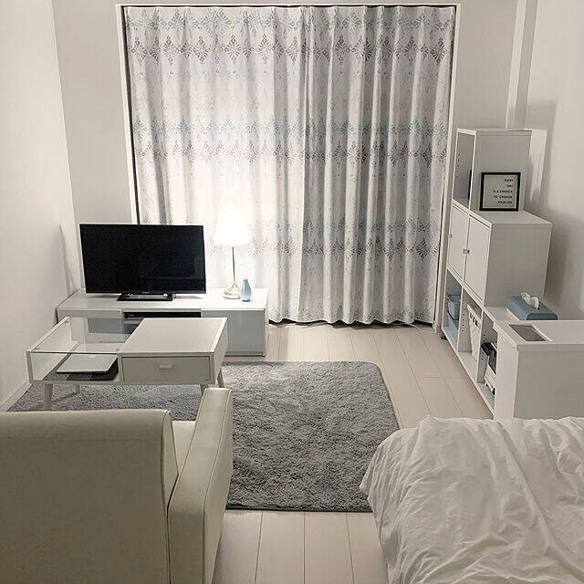 一人暮らしをされているmelissaさん。8畳ワンルームの一角に、丸いガラステーブルがあります。ブラックのフレームが、全体を引き締めてくれています。ラグのゴージャスな柄がいきる配置ですね。どことなくただようアンティークな世界観に惹かれます♡
