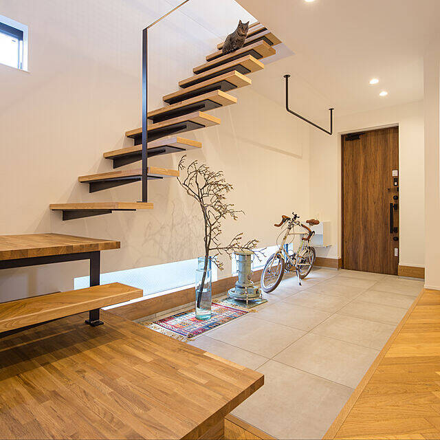 大きなフラワーベースからストーブ、自転車まで余裕で置ける、広々とした玄関です。こちらのお家は、玄関土間が階段室も兼ねたレイアウトになっています。宙に浮くような片持ち階段が軽やか。上部は吹き抜けで、地窓ももうけられているので、明るく開放感たっぷりですね。