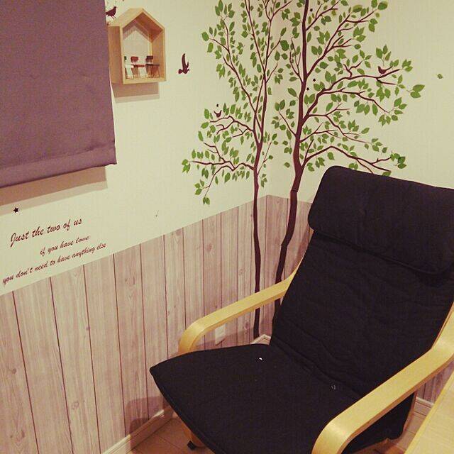 yorikaさんはダイニングに、キャンドゥの「板壁風インテリアシート」で作った腰壁と、大きな木のウォールステッカーを貼られています。「庭」をテーマに、腰壁を塀に見立てているそうですよ。清々しい空気を感じられそうな一角ですね。