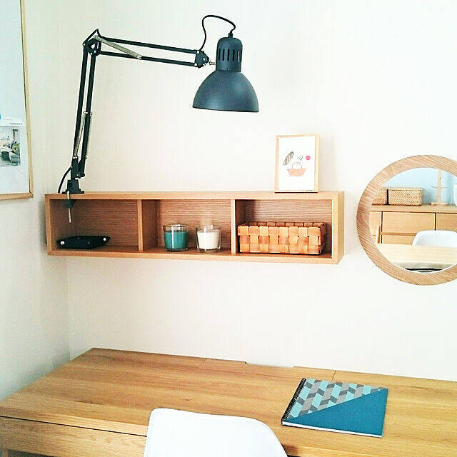 すっきりとクラシカルなデザインのこちらのデスクライトは、IKEAの「TERTIAL (テルティアル)」です。momo0907さんは、無印良品の「壁に付けられる家具」に取り付けて使っています。ナチュラルなインテリアによく馴染み、「いかにも作業スペース」という感じのしない落ち着いた一角になっていますね。