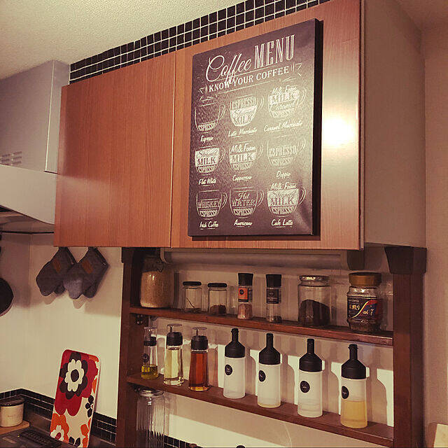 キッチンにニトリのキャンバスポスターを貼られたという、shiratamaさん。黒地に白いチョークで描かれたようなデザインが、スタイリッシュですね。コーヒーのメニューが描かれたポスターで、カフェ風の空間を演出してくれます。