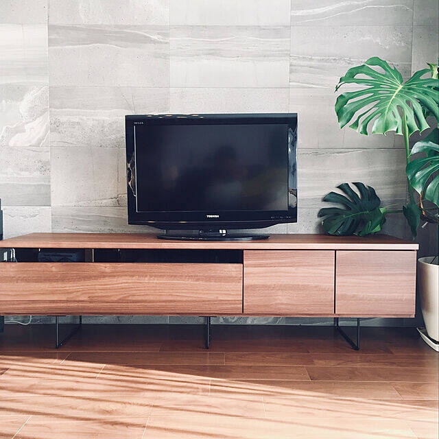 こちらのユーザーさんが選んだのは、木目調のテレビボードです。床とほぼ同じ色味なので統一感がありますね。落ち着いたナチュラル感いっぱいのリビングに、モンステラが映えています。ダークブラウンの床とテレビボードの木目で、心が和むリビングです。