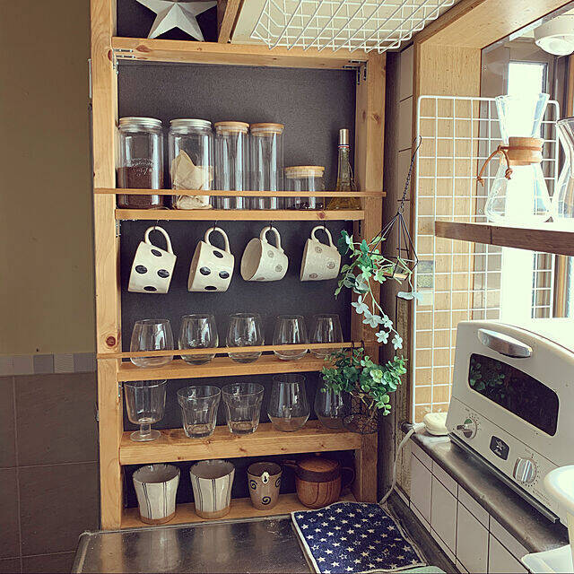 ほこりが気になる場所には、扉付きがおすすめ。ユーザーさんは冷蔵庫の横にカップや瓶を収納できるカップボードを作られています。アクリル板で作った扉をつけることで、ほこりをカバーしながらディスプレイを楽しめます。キッチンで過ごす時間も楽しくなりそうですね☆