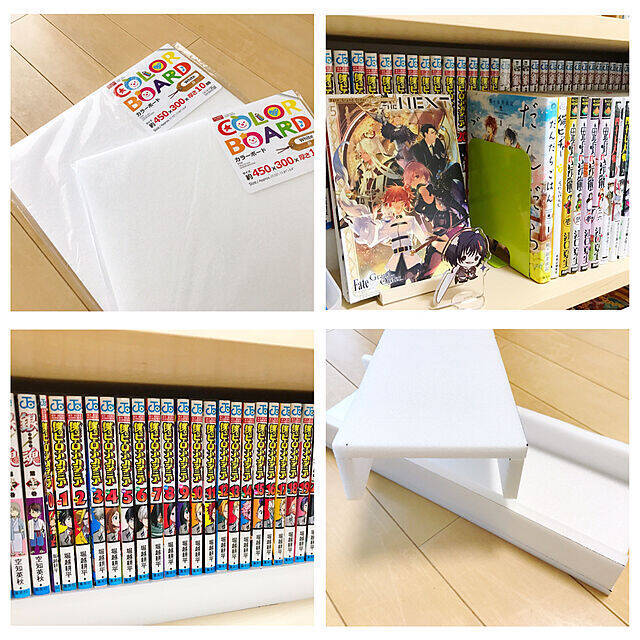 ダイソーのカラーボードを使って、コミック用の台を製作されているksfioriさん。高さだけでなく、横幅も持っている本棚に合わせることができる、便利なアイデアです。カラーボックスなどの高さがあまりない収納でも活躍してくれそうです。カラーボードは軽く扱いやすい点もうれしいですね。
