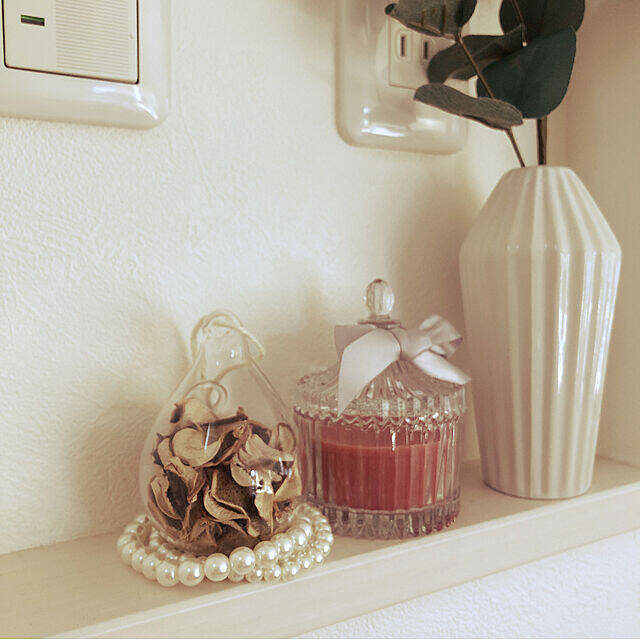 ころんとしたしずくの形がキュートなガラスボトルに入ったポプリを飾られているnecoさん。落ち着いた色合いのポプリと、品のあるパールやキャンドルが上品な雰囲気をつくり出しています。ポプリもアロマキャンドルもダイソーで購入されたものだそうです。