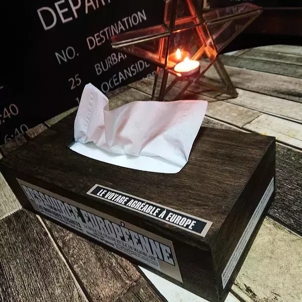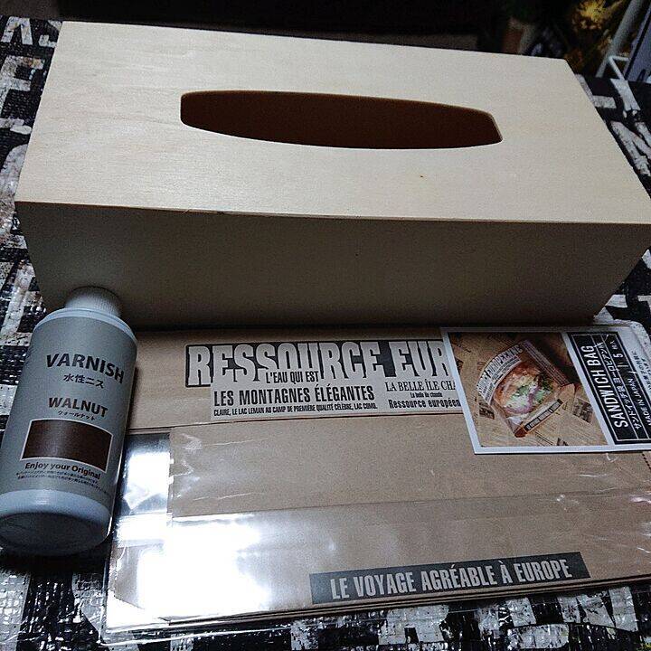ウッドティッシュケース【Seria(セリア) 売場:ランドリー】サンドイッチ袋ヨーロピアン柄【Seria(セリア) 売場:キッチン用品】水性ニス ウォールナット【Seria(セリア) 売場:DIY材(スノコ、工具、フック等)】■必要な道具