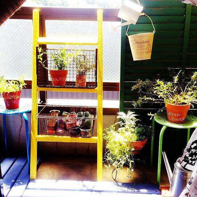 こちらのユーザーさんは、DIYでベランダガーデン用のラダーシェルフを作ったそうです。元気なイエローが眩しいですね。カゴと組み合わせて観葉植物を飾っています。明るい気持ちにさせてくれるグリーンスペースの完成です♪