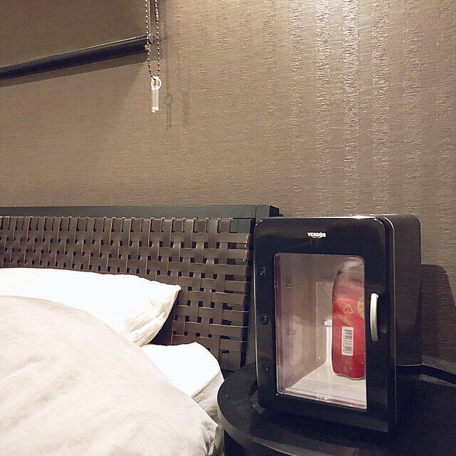 ミニ冷蔵庫をベッドサイドに設置されているMasaさん。サイドテーブルとしても使えて、一石二鳥です。シンプルで角のあるシャープな形はスタイリッシュなお部屋にぴったりで、家具との統一感もありますね。