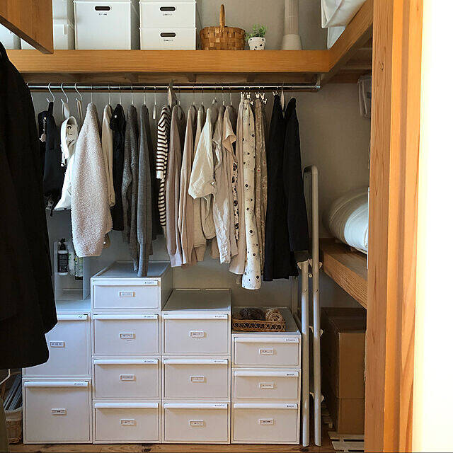 sumosarozaさんのクローゼットには、シーズン中に着なかった服の仮置きボックスが設置されていました。着ていない服はハンガーにかけずボックスに入れてしまえば、本当に必要な洋服だけが取り出せてすっきりが保てますね。処分のタイミングも見つけやすく、洋服に対する意識を日常的に維持できます。