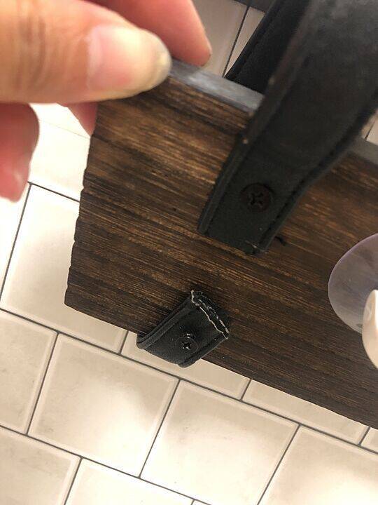 続いて、棚板となる木材に着色をしていきます。しっかりと乾いたら、STEP1で用意したベルトを板の左右それぞれに巻いてください。裏側で、写真のようにネジ留めします。