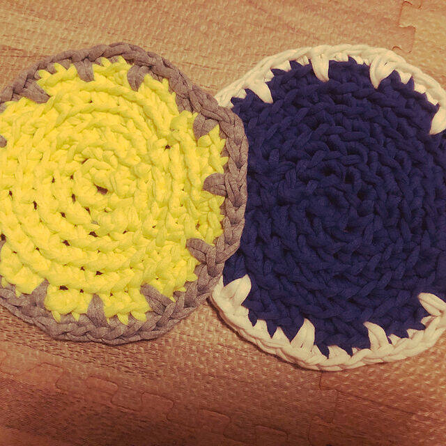 カラフルな鍋敷きは、ダイソーのTシャツヤーンで編まれたそうです。それぞれ中心にイエローとネイビーを配置して、ぱっと華やかなデザインに。ざっくりとした編み目はキュートで、あたたかみを感じられますね☆