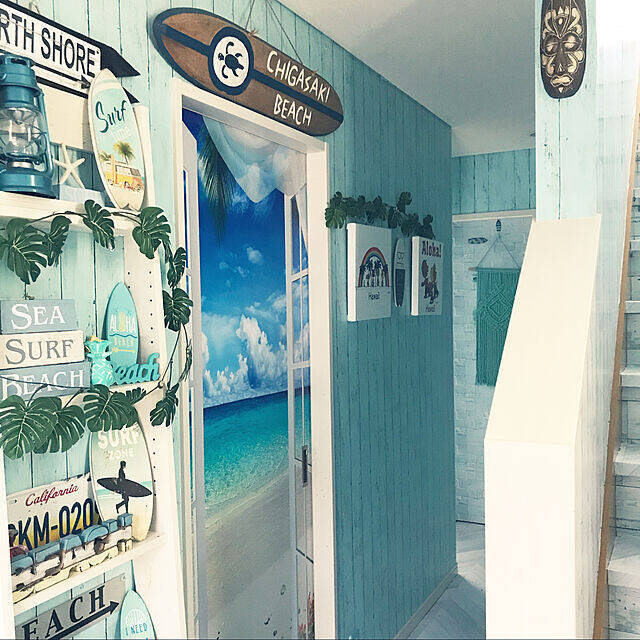 まるで海の家に遊びに来たような気分が味わえるお部屋です。ドアに貼られた海デザインのステッカーが、ビーチ感をさらにアップさせていますね。たくさん飾られたビーチ雑貨と相まって、完成度の高い空間になっています。