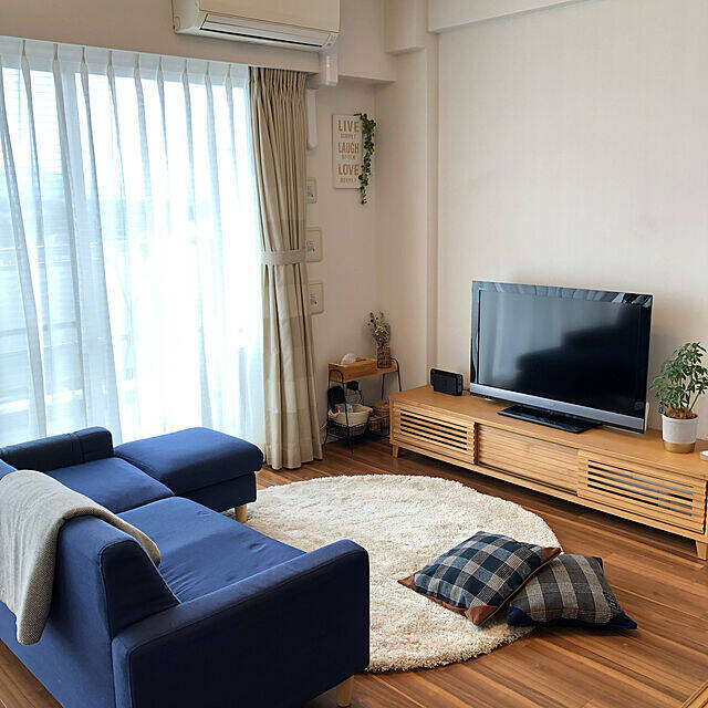こちらのmaiさんのリビングルームには、円形ラグをコーディネート。ソファやテレビ台など直線的なラインが多い家具の中に、丸いラグがほどよい抜け感をあたえてくれます。丸い角から床が少しのぞくのもスッキリ見えるポイントですね♪ラグの明るいカラーがやさしい印象で、ブルーのソファが映えています。