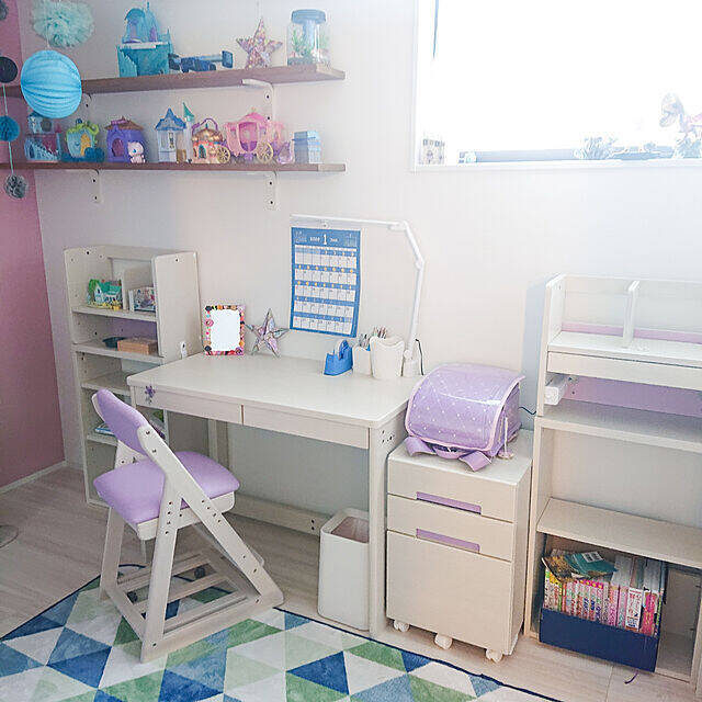 kico.kwdさんご紹介の学習机は、「くみあわせですく」です。4分割できる本棚、USBポートや二口コンセント、LEDライトも付いています。お子さんのテンションが上がるパープルがアクセント♡ランドセルや椅子も同色でコーディネートされています。