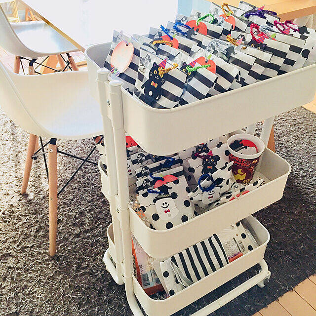 IKEAのワゴンをイベント用に使っている、kikiさん。ハロウィンなどでお菓子を子どもたちに配るときに便利ですね。たくさん収納できてキャスター付きなので、移動もラクラク。ワゴンのホワイトが、お菓子のパッケージのかわいさをより引き立てくれるので、子どもたちのテンションも上がること間違いなしです。