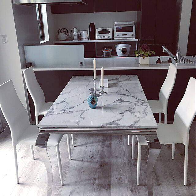 海外から取り寄せたという大理石テーブルをダイニングに置いているユーザーさん。大理石ならではの模様が自然の壮大な魅力を感じさせますね。白いチェアも上質そうで、ラグジュアリーな雰囲気がたまりません!