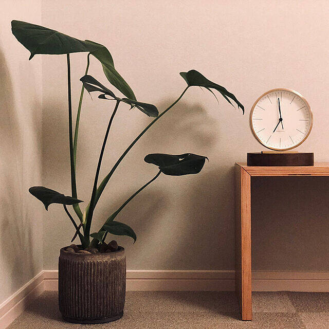 寝室の「コの字の家具」の上に、北欧デンマークのハウスドクターの時計が置かれているkayuwaさん。コの字のスクエア、時計のラウンドにモンステラのリズム感が調和し、美しく落ち着いた雰囲気を醸し出しています。