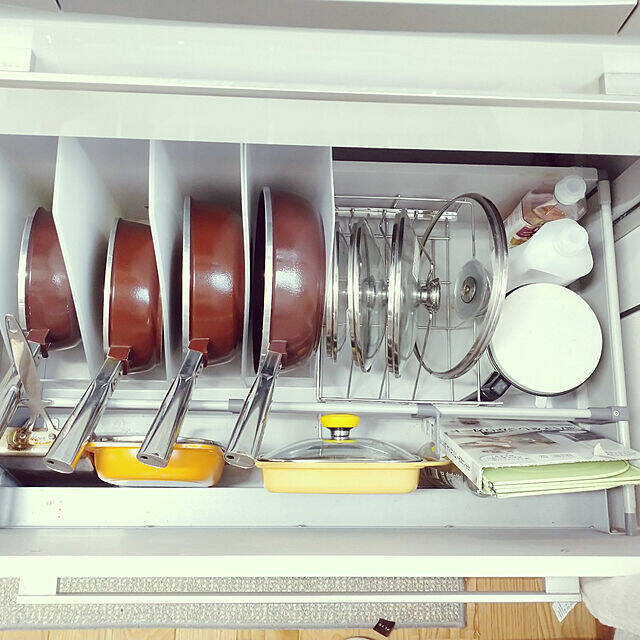 _rant_3_0_ さんはダイソーのレターラックを使って、フライパンなどを収納しています。こちらは高さを変えられる優れモノで、深さのある鍋もばっちり入ります!キッチンの開き戸を開けてすっと取り出せるので、とても使いやすいそうです。100均のアイテムなので、数が増えても気軽に買い足せますね。