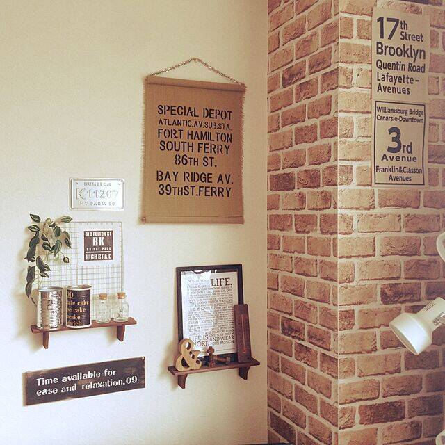 レンガ壁が印象的なこちらのおうち。壁面にはさまざまな雑貨をディスプレイしているなかで、左上のシルバーのプレートはセリアのものだそうです。ギラギラした見た目がブルックリン風の空間によく馴染んでいますね!