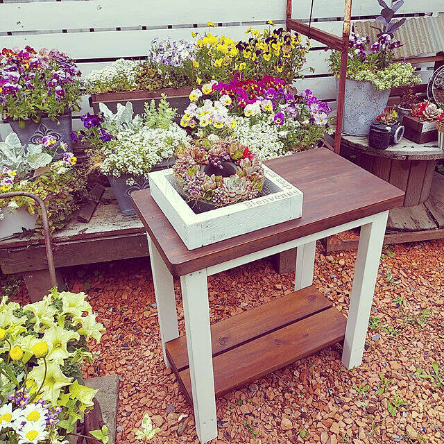 ハンドメイドでガーデンテーブルを作っている、Toiroさん。落ち着きのある色味のウッドテイストが、お花の鮮やかさをうまく引き立ててくれていますね!花を置くスペースとしてはもちろん、ガーデニングアイテムの収納にも役立てられそうです。木の温かみも感じられる、ナチュラルなガーデンに仕上がっていますね。