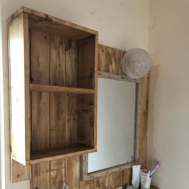 洗面台の横に廃材を利用して、ハンドメイドした収納棚を取り付けているkonnakanjiさん。木材がたくさん使われた温かみのある洗面所で、ナチュラルな印象も感じられます。ハンドメイドなので、収納したいものに合わせたサイズ感で作ることができて、使い勝手もよさそうですね。