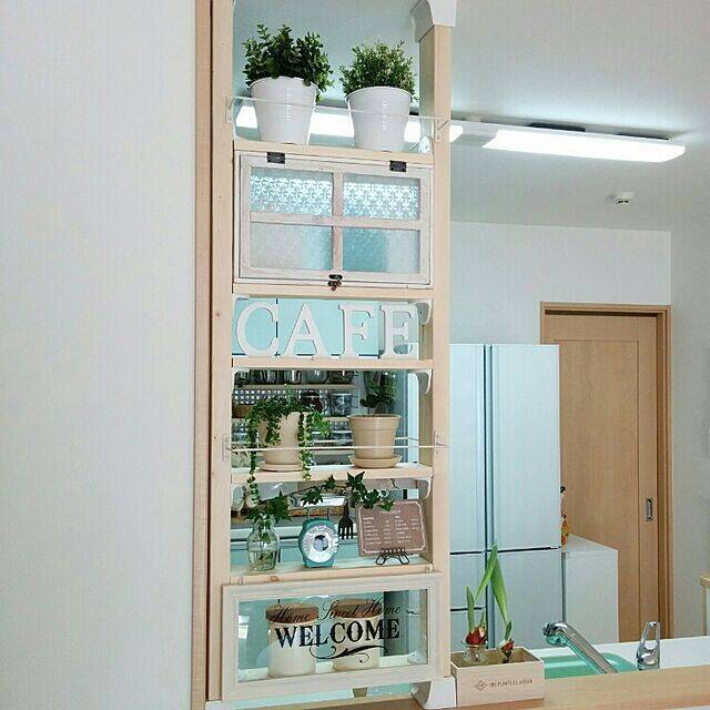 miyuさんは、キッチンカウンターにハンドメイドのディアウォール棚を取り付けています。キッチンカウンターの空いたスペースに合わせて作れるので、空間を無駄なく使えていますね!フェイクグリーンや雑貨などが飾られ、キッチンの生活感を感じさせません。デッドスペースもディスプレイ空間にできるアイデアですね。