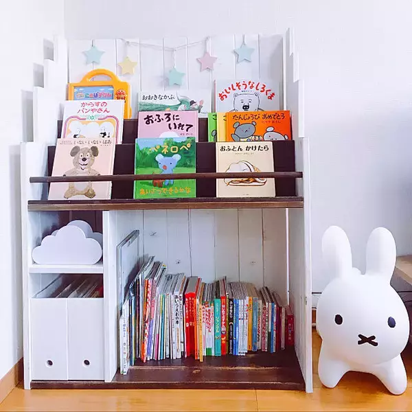 ハンドメイドの絵本棚にお子さんの本を収納している、nanaeさん。明るいホワイトでペイントされたやさしいデザインで、お子さんのものを収納するのにぴったりですね。収納したい量や好みに合わせて自由に作れるので、長く大切に使えそうです。収納スペースもたくさんあるので、大切なものを十分に管理できますね。