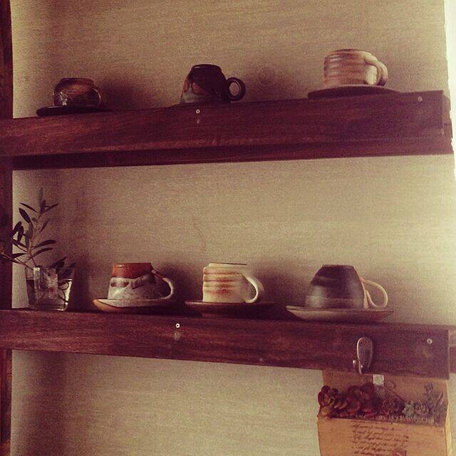 happychocoさんは、ハンドメイドの棚にティーカップを飾っています。ハンドメイドの棚であれば、自分の目指したいインテリアに合わせたデザインに仕上げることができます。このように見せる収納にすると、カフェ風の印象にもなりますね。落ち着きのある棚の色味と、味わい深いティーカップの相性もぴったりです。