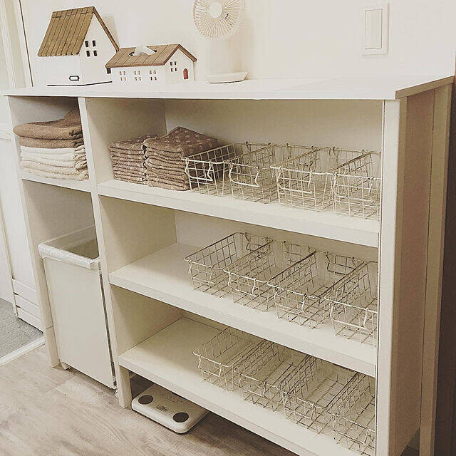chiisanaashiatoさんは、ハンドメイドで脱衣室の収納棚を作っています。脱衣所はタオルや衣類がたくさん集まる場所なので、このようにたくさん収納できる棚であれば安心ですね!白で統一されたデザインで清潔感も感じられます。ゴミ箱も収納できる形状になっており、空間をスッキリと見せてくれていますね。