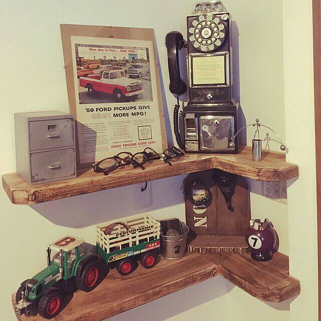 BONBONSTYLEさんは、デッドスペースになっている壁部分にハンドメイドのシェルフを取り付けています。壁の角に沿った形状で、ハンドメイドならではのぴったりのサイズ感ですね!雑貨がたくさん飾られており、趣味のスペースとしても楽しめそうです。ハンドメイドなので、デザインや色味も自由に作れますね。