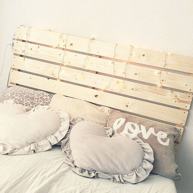 Maoさんは、すのこを作って壁に貼り、ヘッドボードにされています。フェアリーライトや、ベッド上のたくさんのクッションがロマンチックで、海外のお部屋のような雰囲気ですね。ナチュラルなヘッドボードが空間の引き立て役になっています。