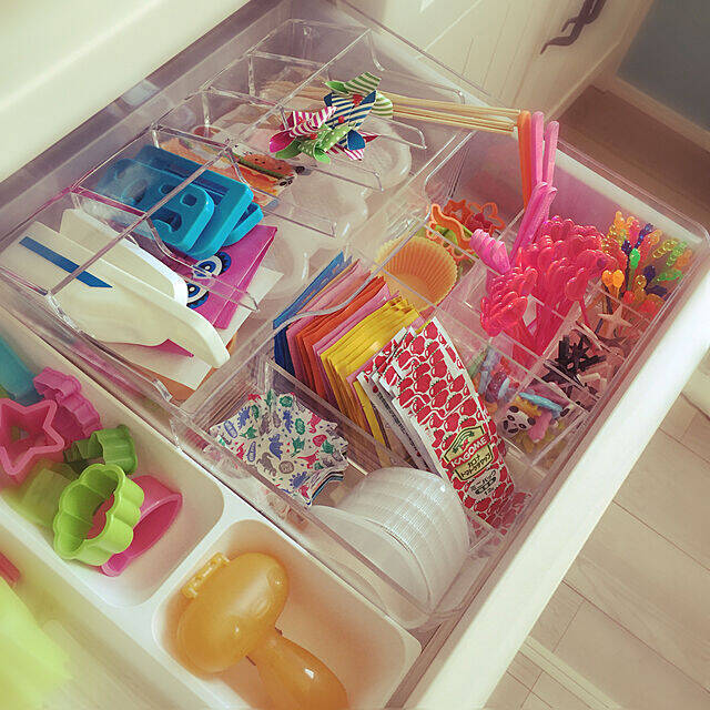 mimiさんはキッチンの引き出しの中に、お弁当グッズを収納しています。仕分けに使っているのはIKEAのコスメ収納。マニキュアやリップなどを入れる部分は、ピックを立ててしまうのにピッタリです。