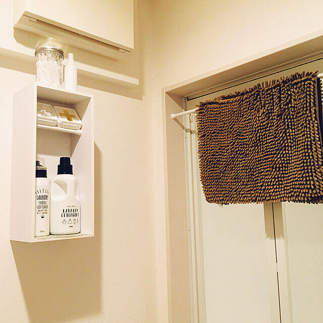 myaaaさんはお風呂場のドアにつっぱり棒を取り付け、バスマットを干しています。つっぱり棒は上の方に取り付けてあるので、バスマットを干した状態でもドアを開け閉めしやすそうですね。ふわふわと足触りのよさそうなバスマットも、すぐに乾きそうです。