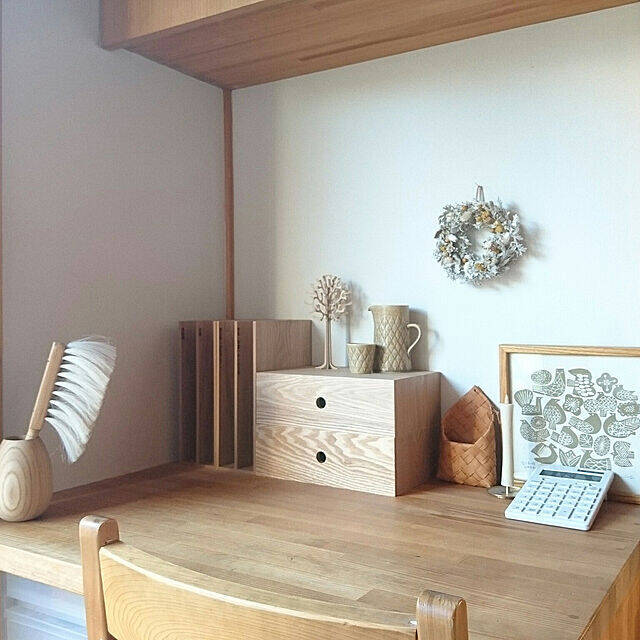 無印良品のMDF小物収納をデスク上の収納として使われている、yumihoさん。奥行きの浅いMDF小物収納は、デスクの上に置いても圧迫しないとのこと。2段重ねにすれば、収納力もしっかりとありそうですね。