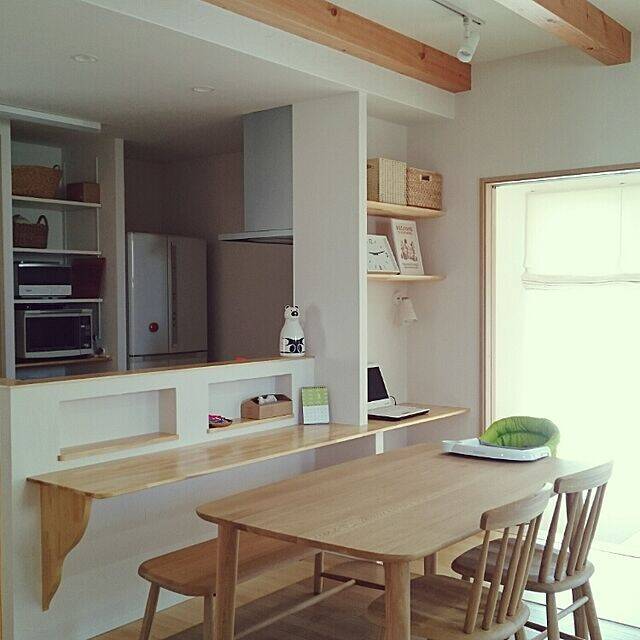 ki-koさんは、パソコンスペースも兼ねたカウンターを取り入れています。ダイニングテーブルと同様のウッド調なので、リビングとの統一感もありますね!キッチンと対面しているので、リビング側とのコミュニケーションもとりやすそうです。パソコンスペースもあり、在宅ワークにも向いていそうですね。