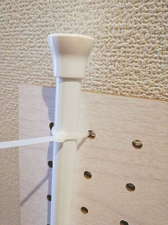 まず、有孔ボードとつっぱり棒を固定します。有孔ボードの穴、左端2列の一番上に結束バンドを通しつっぱり棒に巻き固定してください。下の穴も同様に留めます。もう1本のつっぱり棒も右端に固定してください。